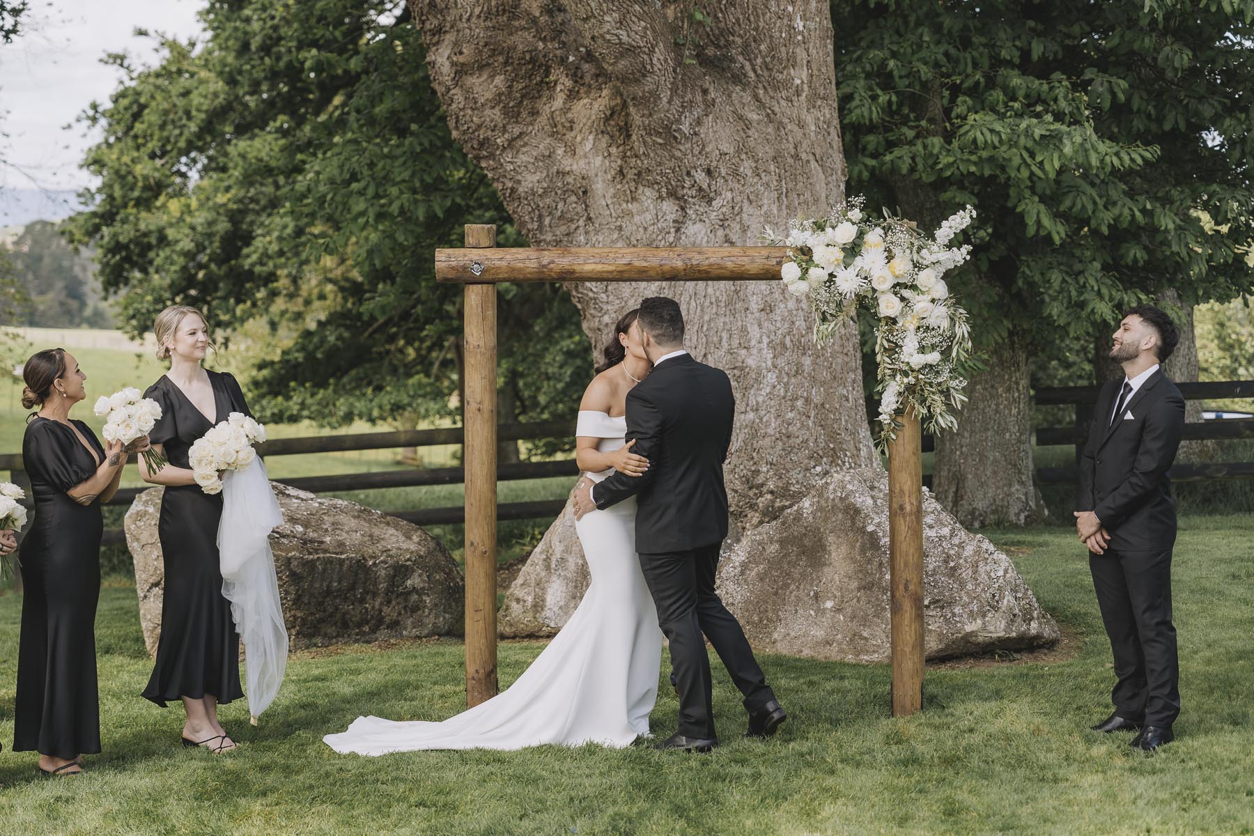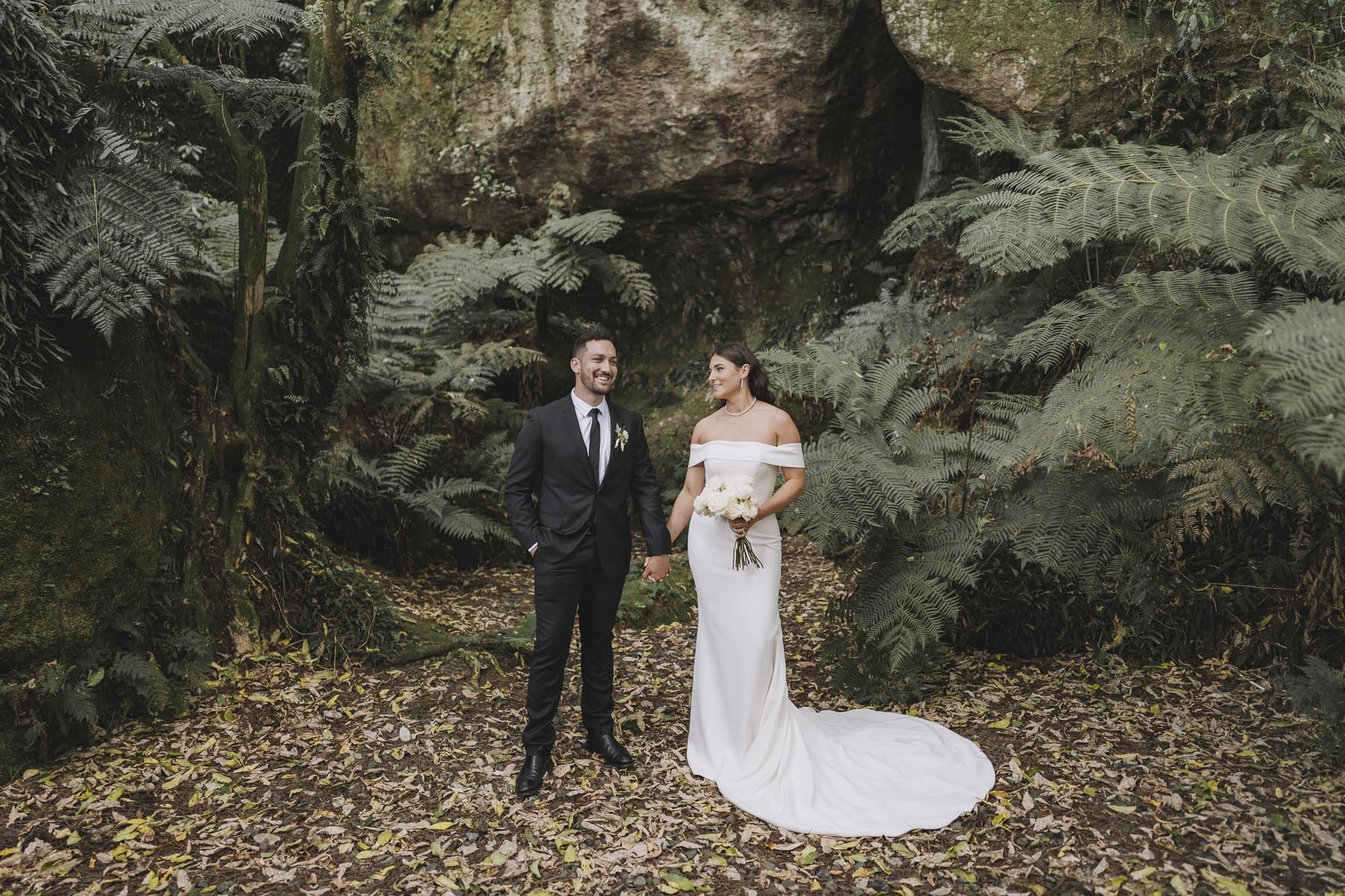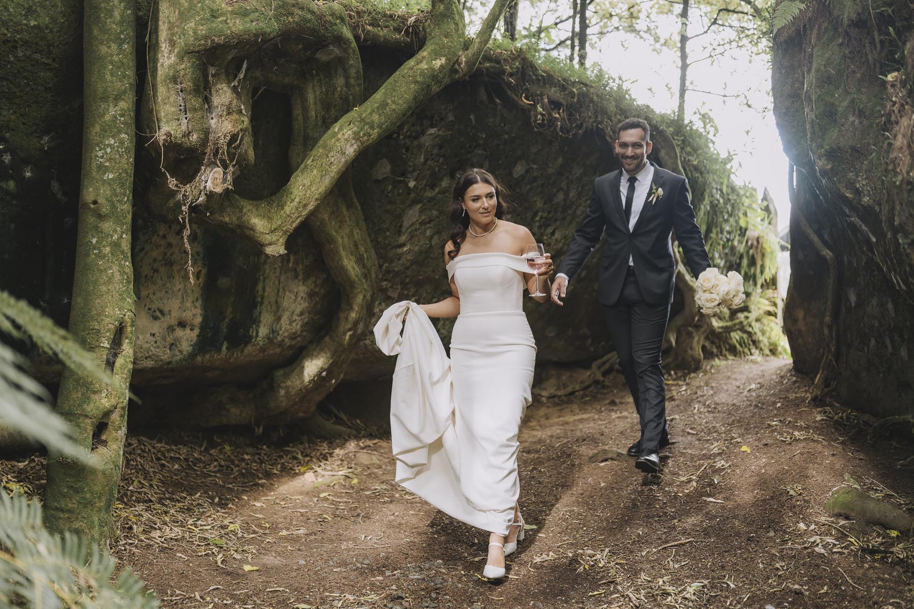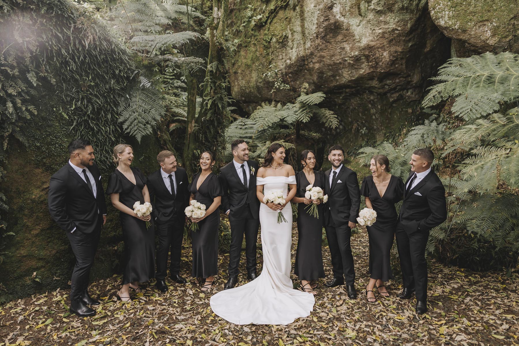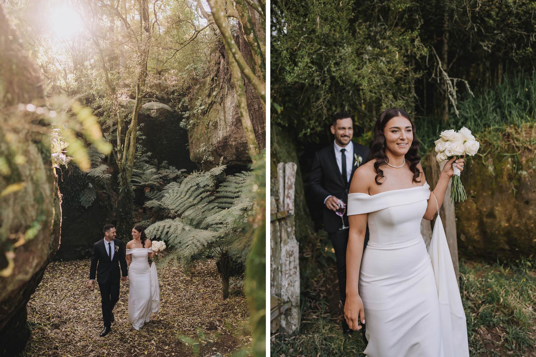 I’ve been lucky enough to shoot at The Red Barn many times, but this was my very first chance to explore their secret grotto. It’s a pocket of native bush hidden away from the main action, and honestly, it feels a bit magical. Jasmin and Kalen disappeared there with their bridal party for some time out, and it turned out to be the dreamiest spot for photos, soft light, rock and fern surrounds, such a great zone to slip away to.