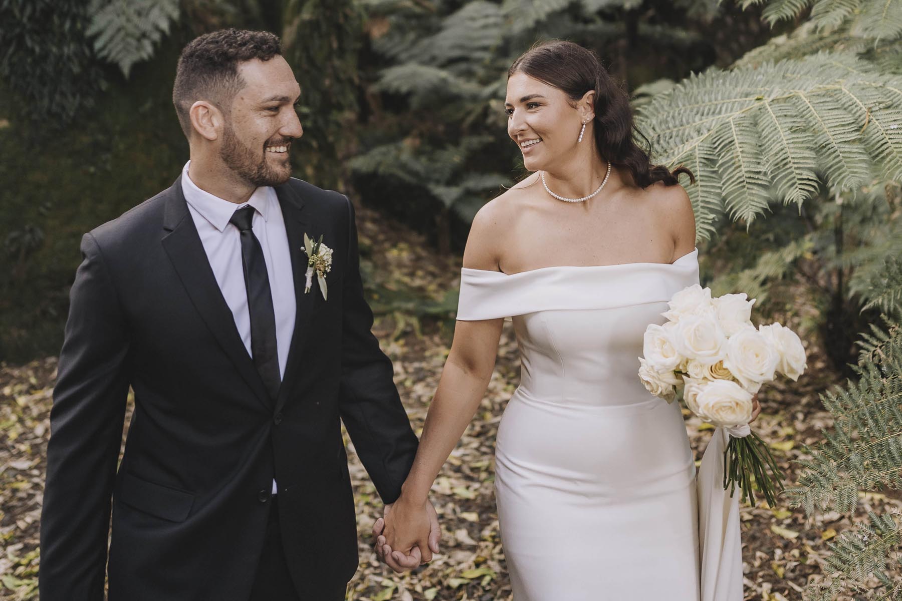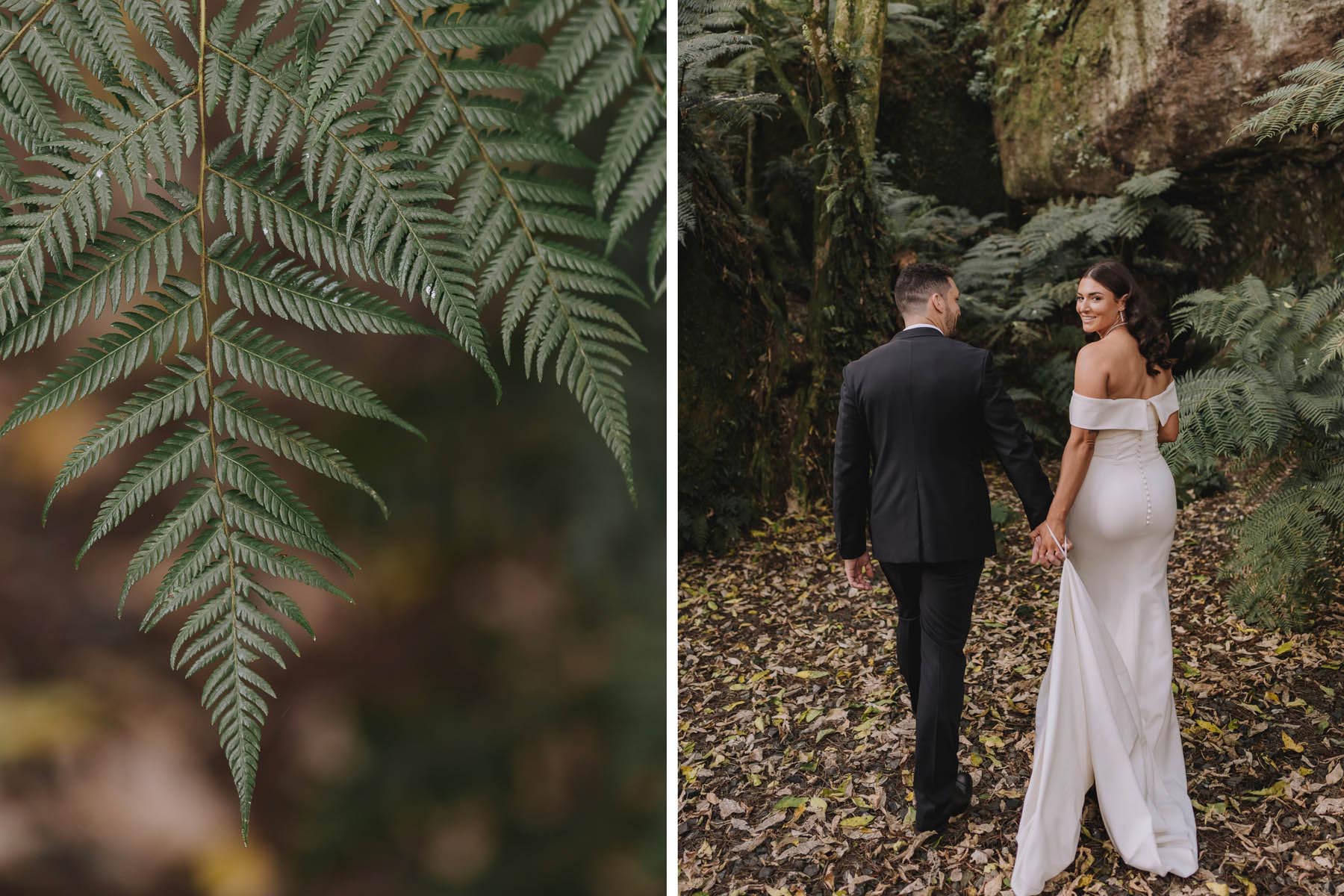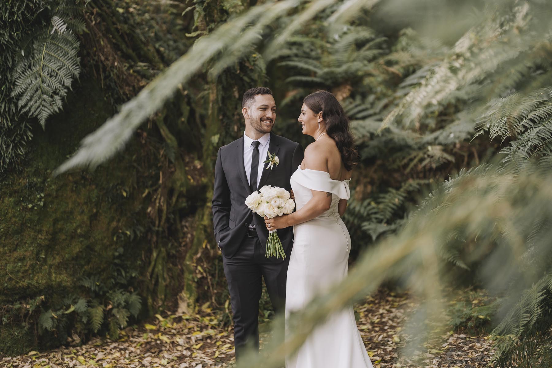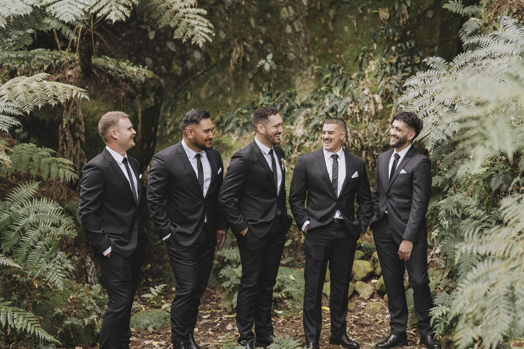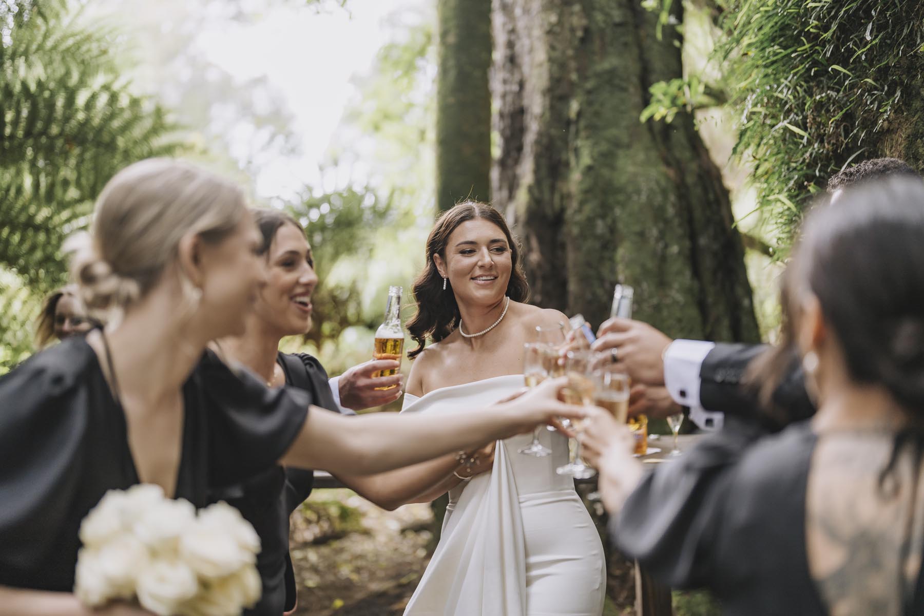 I’ve been lucky enough to shoot at The Red Barn many times, but this was my very first chance to explore their secret grotto. It’s a pocket of native bush hidden away from the main action, and honestly, it feels a bit magical. Jasmin and Kalen disappeared there with their bridal party for some time out, and it turned out to be the dreamiest spot for photos, soft light, rock and fern surrounds, such a great zone to slip away to.