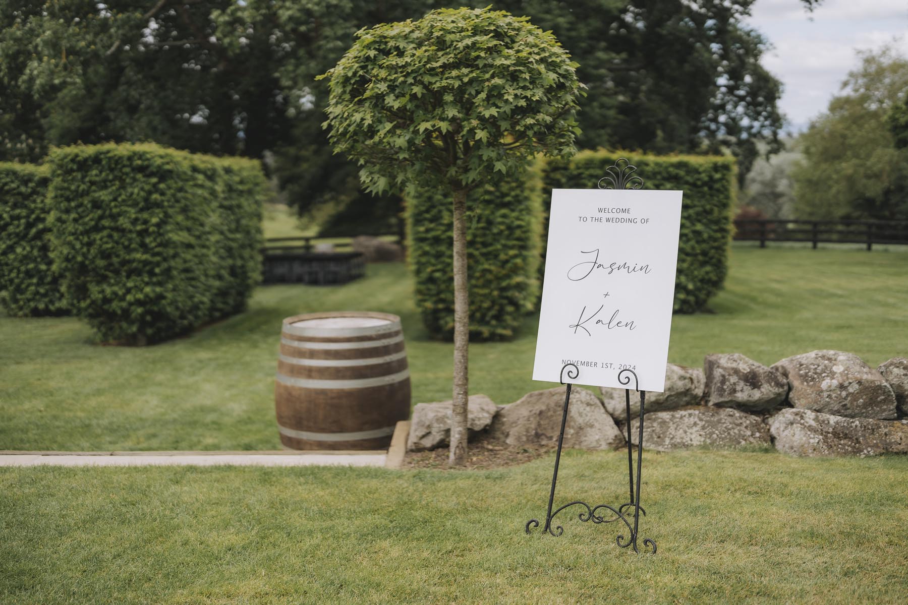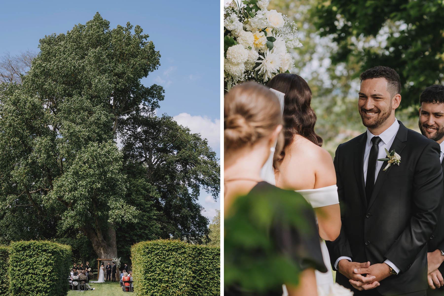 Jasmin & Kalen’s ceremony took place in the garden area, under the oak tree tucked in behind tall hedging. It felt private and cosy, almost like their own secret garden, with the greenery creating the perfect natural backdrop as they exchanged vows. After the “I do’s,” everyone spilled out onto the lawn with bubbles and laughter before moving into the barn for dinner and dancing.